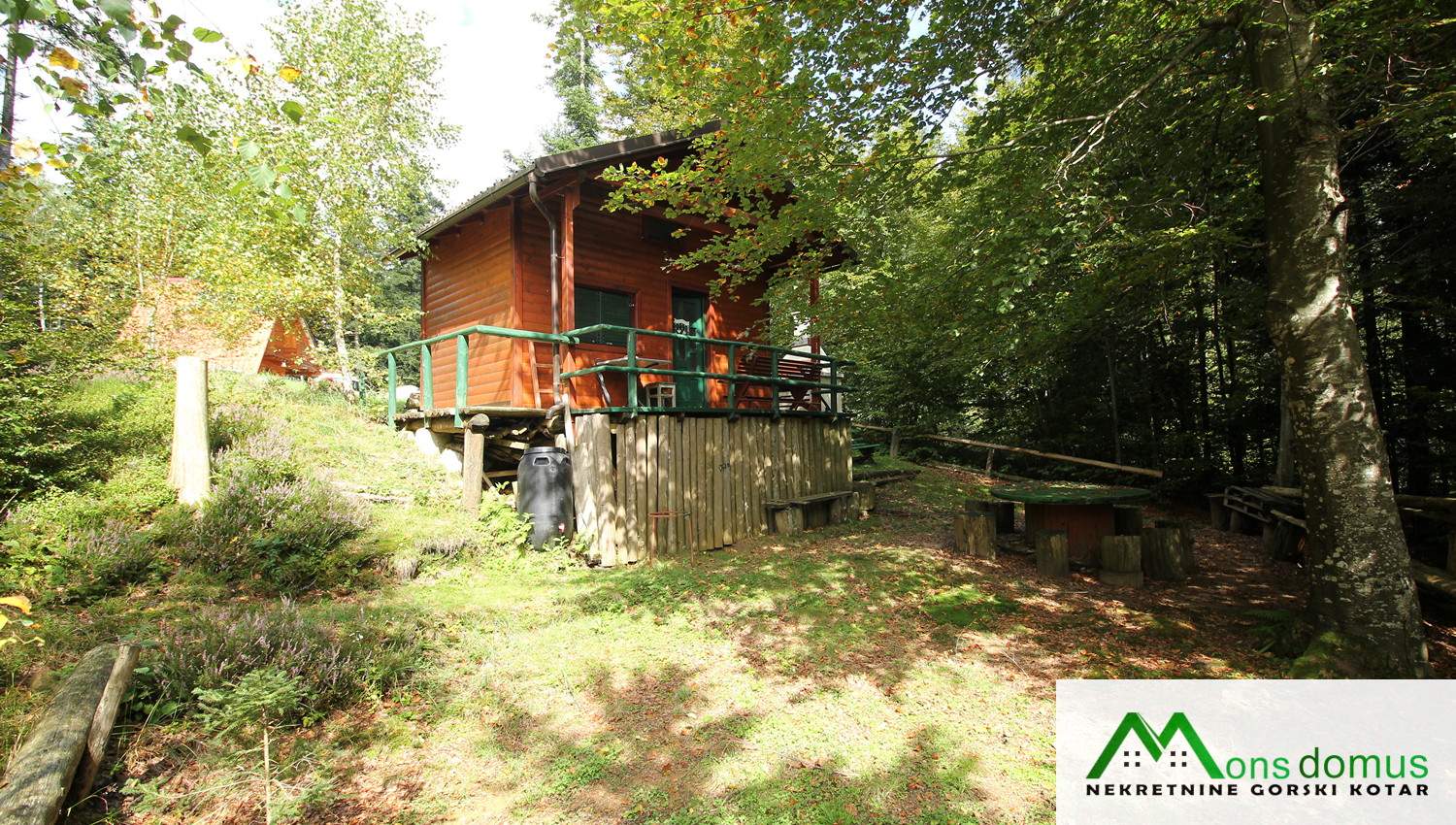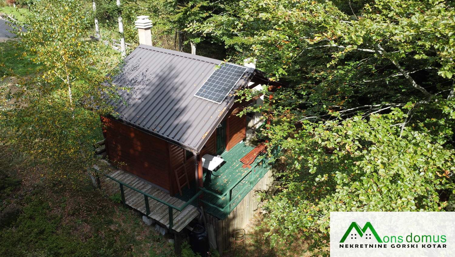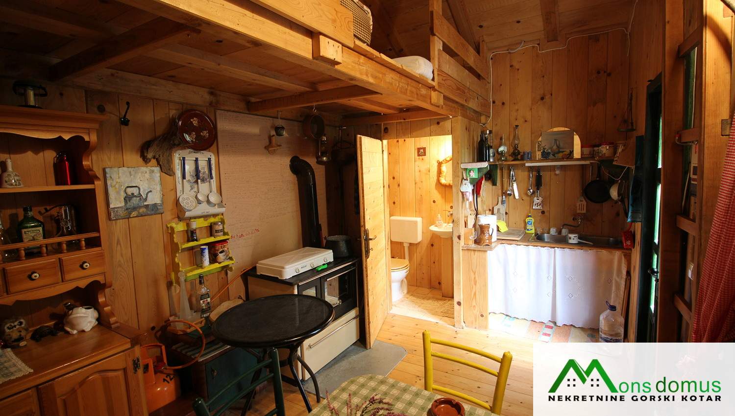 Na zemljištu se nalazi mala, drvena kućica tlocrtne površine 22 m2 s natkrivenom terasom, idealna za kraće boravke. Objekt je opremljen solarnim panelima, spremnikom za vodu te dimnjakom, što omogućuje osnovne uvjete za boravak tijekom većeg dijela godine.