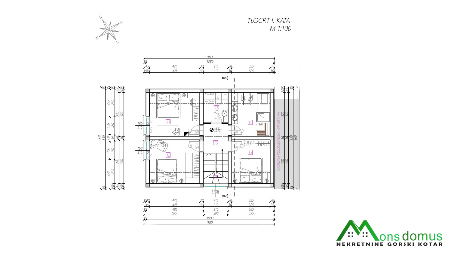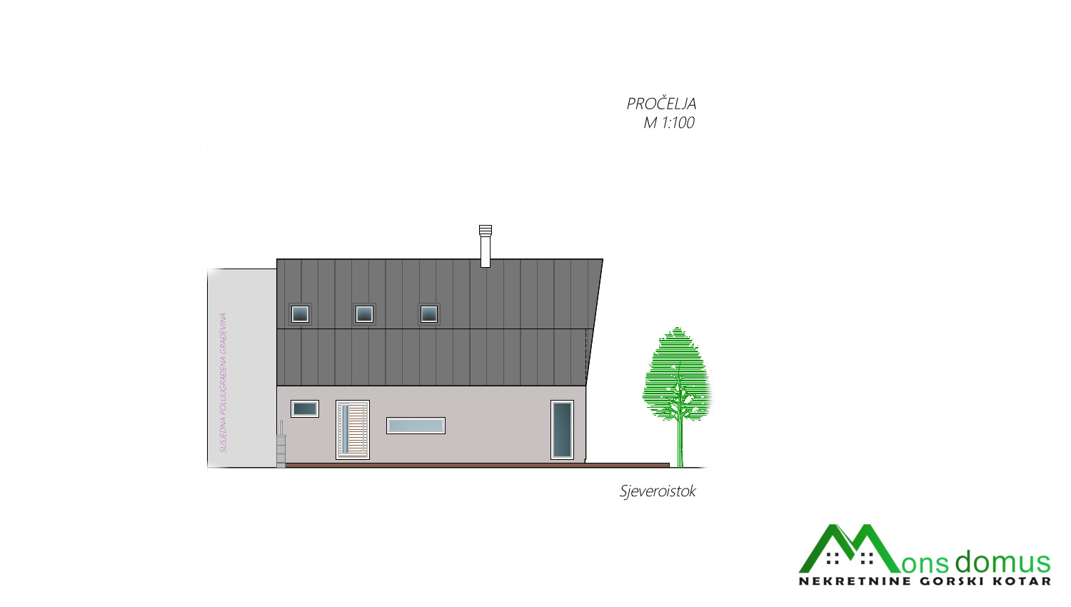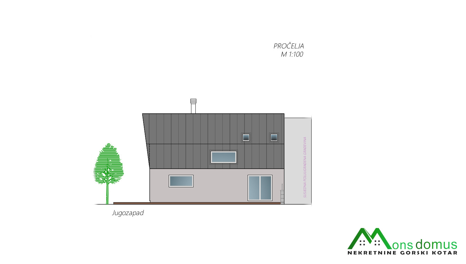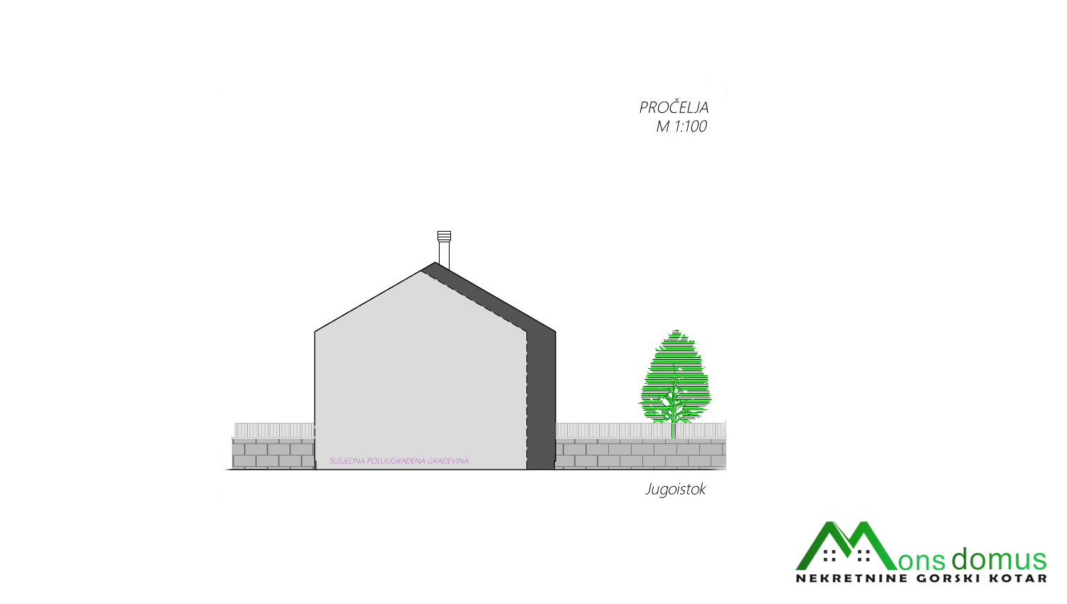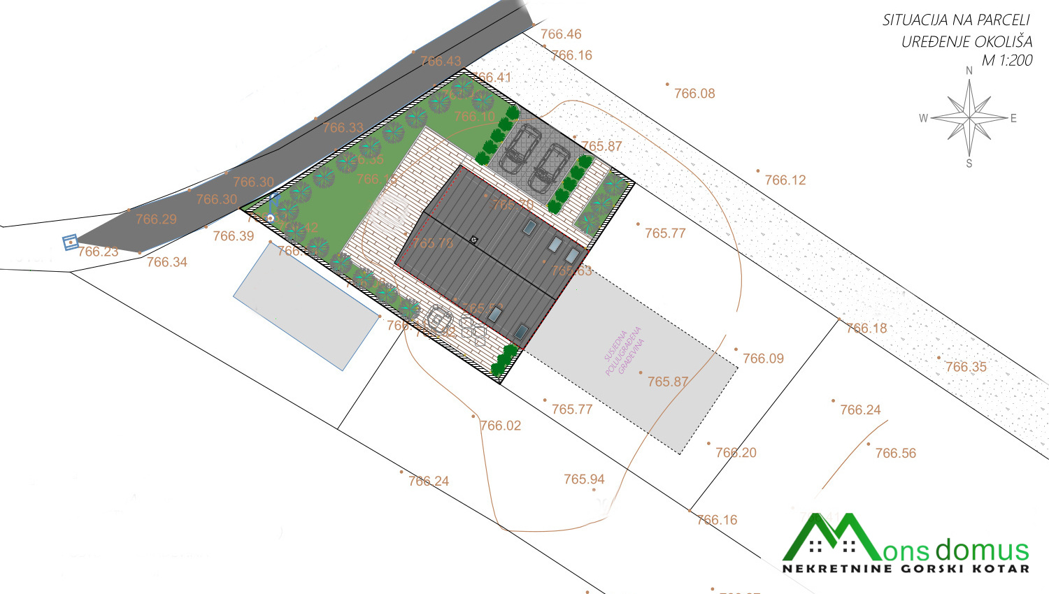 Smješteno je na 760 metara nadmorske visine te ima ishođenu pravomoćnu građevinsku dozvolu za izgradnju dvojnog, stambenog objekta (prizemlje + kat) neto stambene površine 137,52 m2. Prema glavnom projektu, u prizemlju se nalazi predprostor, hodnik, kuhinja i blagovaonica, dnevni boravak, kupaonica te spavaća soba. Na katu su smještene još tri spavaće sobe, kupaonica, vešeraj, predsoblje i stepenište.